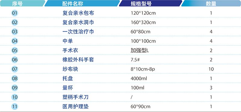 適用于常規(guī)的外科手術,產品主要由高性能無紡布制成的包布、洞巾、一次性治療巾、中單、手術衣和外科手套、紗布塊等配件組合而成,可根據臨床需要更改手術包內配件數(shù)量,配備具有更高防護等級的吸液層或積液袋 , 強化手術關鍵區(qū)域的阻隔能力。