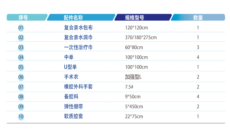 適用于上肢部位手術(shù),產(chǎn)品主要由高性能無紡布制成的包布、洞巾、一次性治療巾、中單、U 型單、手術(shù)衣和彈性繃帶、軟質(zhì)膠套等配件組合而成。洞巾 T 型設(shè)計(jì),手術(shù)關(guān)鍵部位配備有吸液層和彈性膜,可根據(jù)臨床需要更改手術(shù)包內(nèi)配件數(shù)量、配備積液袋,強(qiáng)化手術(shù)關(guān)鍵區(qū)域的阻隔能力。