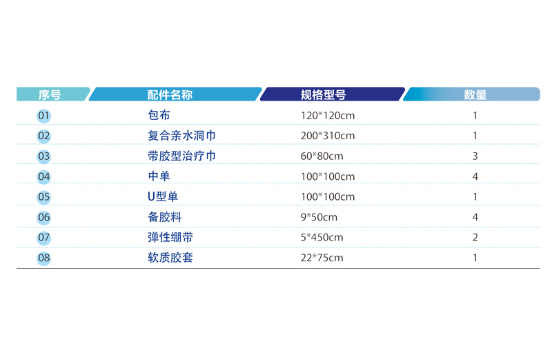 適用于膝關(guān)節(jié)鏡手術(shù),產(chǎn)品主要由高性能無紡布制成的器械臺布、洞巾、一次性治療巾、中單、U型單和彈性繃帶、軟質(zhì)膠套等配件組合而成。洞巾手術(shù)關(guān)鍵部位配備有集液袋和彈性膜,可根據(jù)臨床需要更改手術(shù)包內(nèi)配件數(shù)量,配備具有更高防護等級的吸液層,強化手術(shù)關(guān)鍵區(qū)域的阻隔能力。