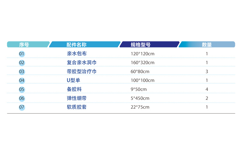 適用于肩關(guān)節(jié)部位手術(shù),產(chǎn)品主要由高性能無紡布制成的器械臺布、洞巾、一次性治療巾、U 型單和彈性繃帶、軟質(zhì)膠套等配件組合而成。洞巾手術(shù)關(guān)鍵部位配備有彈性膜和集液袋,可根據(jù)臨床需要更改手術(shù)包內(nèi)配件數(shù)量,配備具有更高防護等級的吸液層,強化手術(shù)關(guān)鍵區(qū)域的阻隔能力。