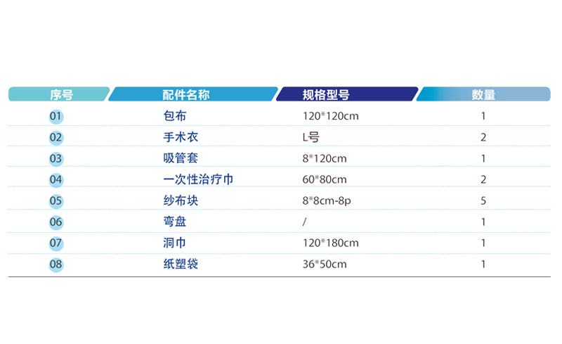 適用于口腔種植、修復及頜面外科的手術(shù),產(chǎn)品主要由高性能無紡布制成的包布、一次性治療巾、洞巾、紗布塊、彎盤、手術(shù)衣、吸管套和外科手套等配件組合而成。主體配件(洞巾)可根據(jù)手術(shù)部位需求設計對應開洞,以滿足口腔種植手術(shù)的需求?筛鶕(jù)臨床需要定制。