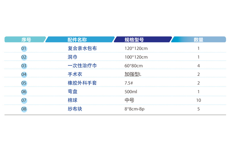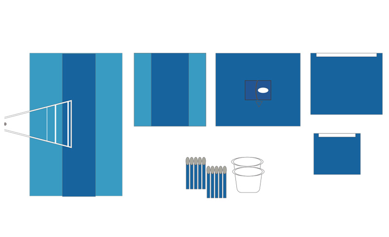 適用于眼科類手術(shù),產(chǎn)品主要由高性能無紡布制成的包布、洞巾、一次性治療巾、手術(shù)衣和外科手套、紗布?jí)K等配件組合而成。洞巾手術(shù)關(guān)鍵部位配備有定型條、集液袋及手術(shù)薄膜,可根據(jù)臨床需求改為雙孔洞巾、配備吸液層,強(qiáng)化手術(shù)關(guān)鍵區(qū)域的阻隔能力。